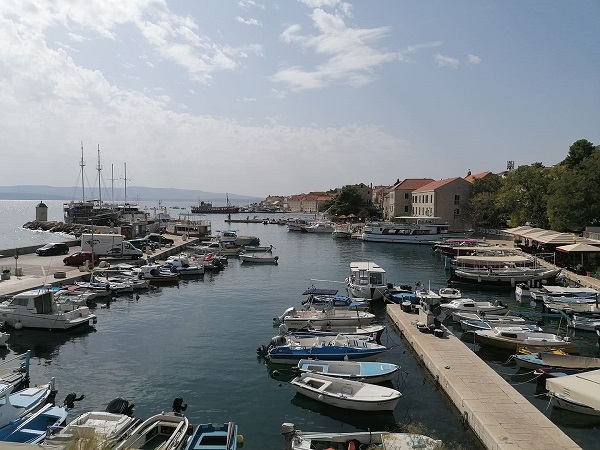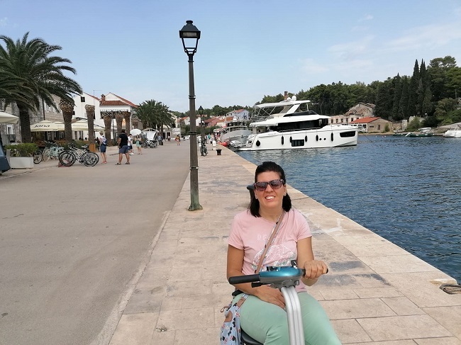 Makarskáról indult a lefoglalt kishajónk. Mindig picit idegeskedek a különböző járművekbe történő beszállásnál, hogy az én esetemben hogyan fog sikerülni összehozni a dolgot… de a parám alaptalannak bizonyult! Az idegenvezetőnk segített leegyeztetni a hajóssal, hogy nekem segítségre van szükségem a fel-leszállásnál. A kapitány és a segédje nagyon készséges volt; miután kiszálltam mopedemből, megfogtak két oldalról és végigvezettek az ingoványos pallón és leültettek a hajó farában álló padok egyikére, majd beemelték és lefektették az összecsukott járgányomat.