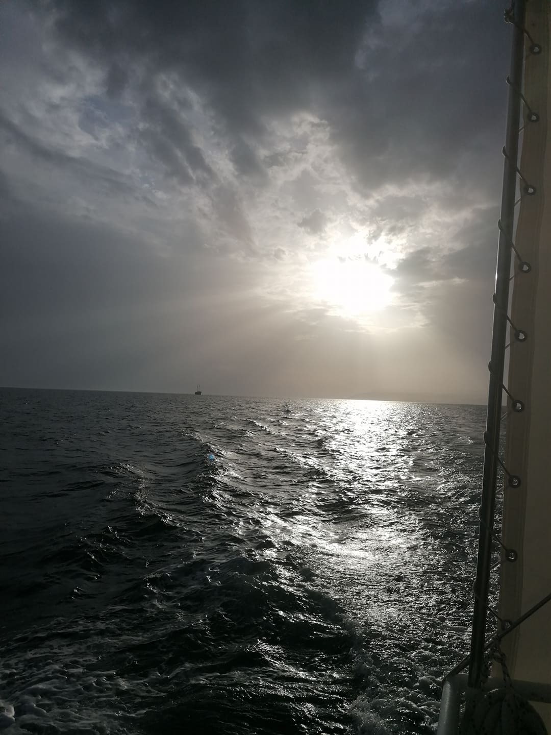 Amikor kiértünk a nyíltabb tengerre, egy bazi nagy hullám telibe kapta a hajónkat, amitől úgy megborult a hajó, hogy mindenki elkezdett dőlni a székével. Az utastársaim azonfelül, hogy próbálták saját magukat stabilizálni, kaptak gyorsan felém – nem igazán tudom tartani magam; már kisebb lökéstől is simán leborulok! Kapaszkodtam az asztalszélébe, de az sem sokáig maradt állva. Mindenkit a mellette ülő széke, vagy a hajókorlát állított meg, miközben önfeledten nevettünk az első sokk után. Miután összeszedtük magunkat, rögtön az jutott eszembe, hogy a moped vajon megúszta-e szárazon! Szerencsére a moped az ellenkező oldalon volt, mint amerre borult a hajónk, így nem érte víz. Még jó, hogy az utunk elején letakartuk egy esőkabáttal. Bár ha a víz beteríti, az nem sokat ért volna…